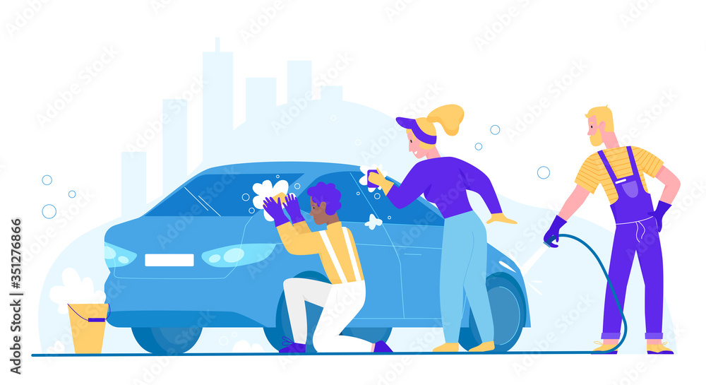 People Wash Car Vector Illustration Cartoon Flat Woman Man Washer Characters Cleaning Dirty Automobile Washing Auto With Sponge And Soap Bubble Carwash Business Service Station Isolated On White Stock Vector Adobe